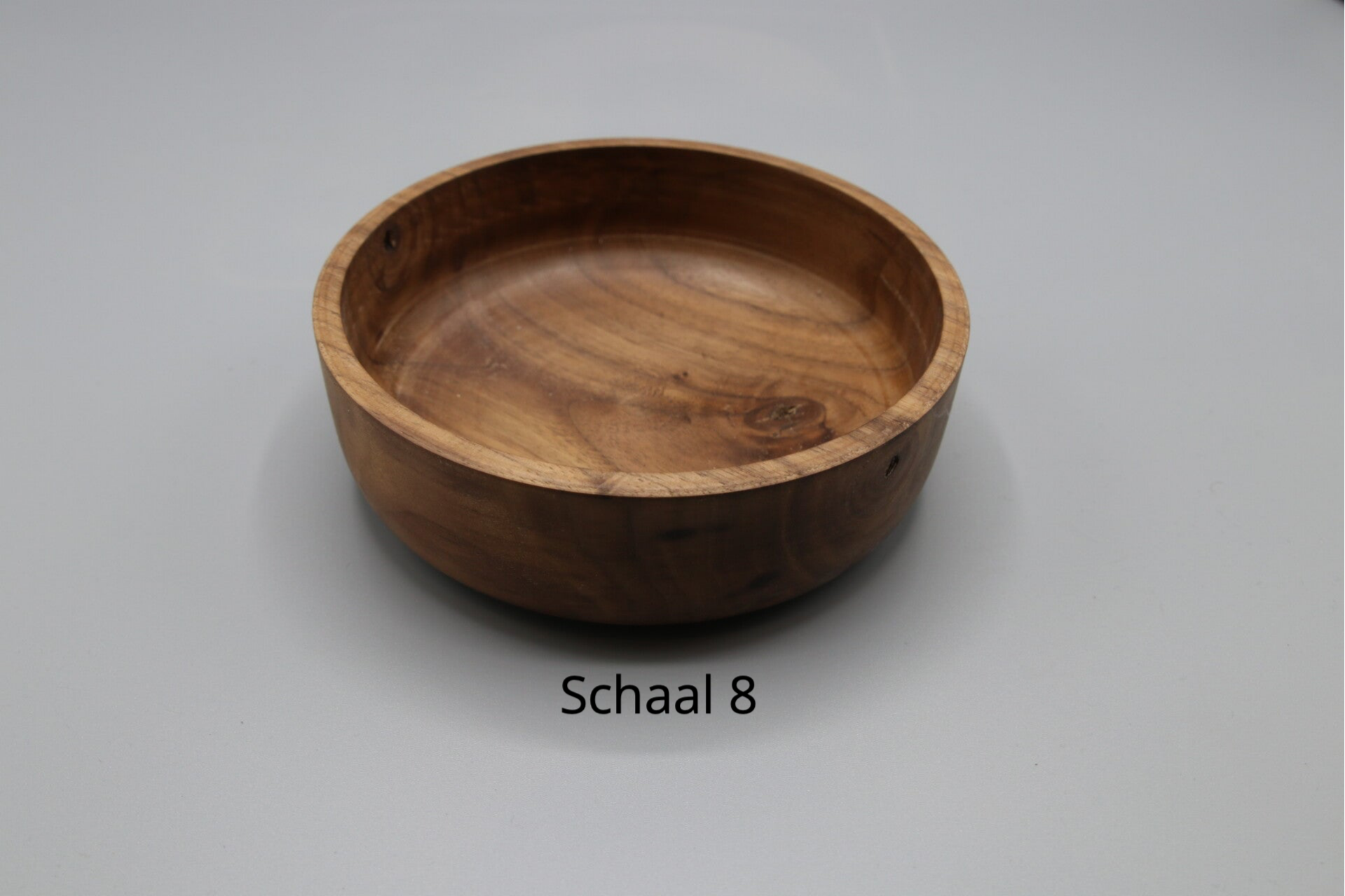 Diverse houten schaaltjes. De afmetingen varieren tussen de 7 en 20 cm in diameter en tussen de 1,5 en 6 cm in hoogte.